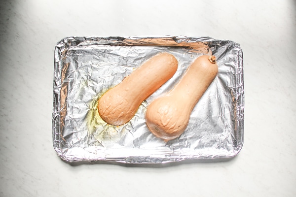 - Cut butternut squash in half. Drizzle olive oil and salt on the baking sheet and place squash cut side down.