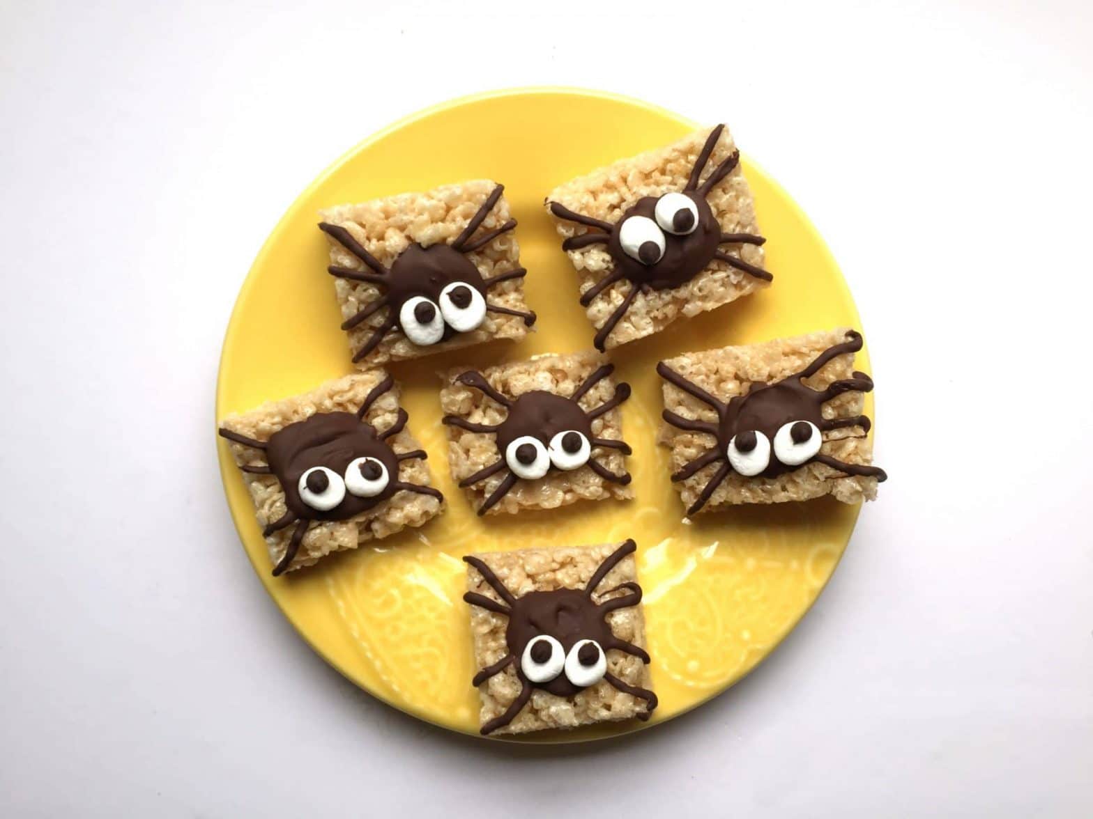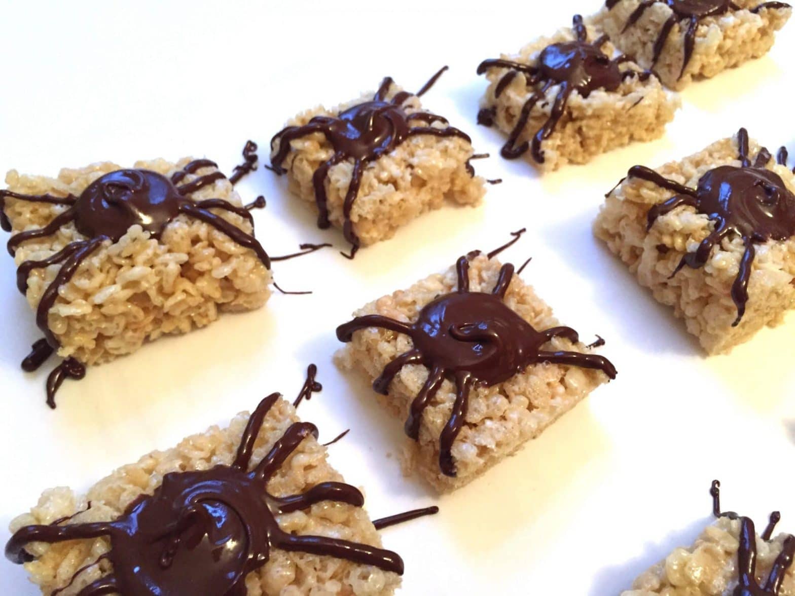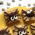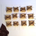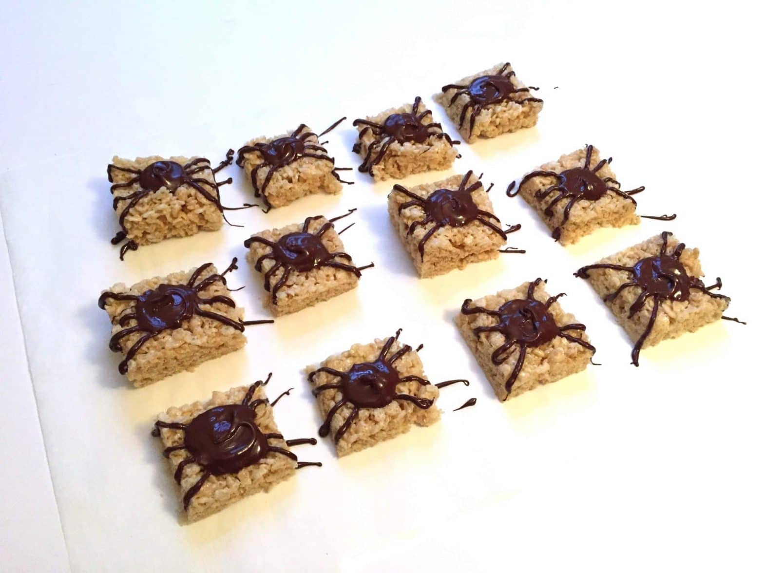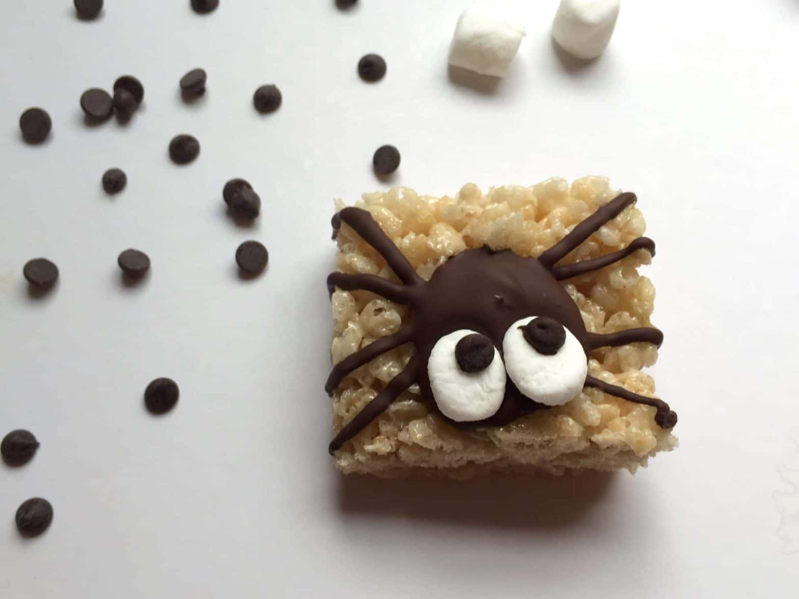 - Cut each of the miniature marshmallows in half, and place them on the spiders' bellies while the chocolate is still melted.