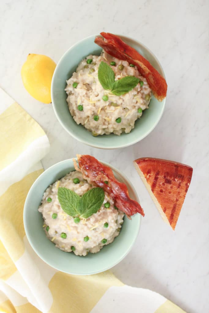 - Top the creamy risotto with chopped mint leaves, lemon zest, and grated cured Mahón-Menorca cheese. Serve each bowl with a crispy prosciutto slice. Enjoy!