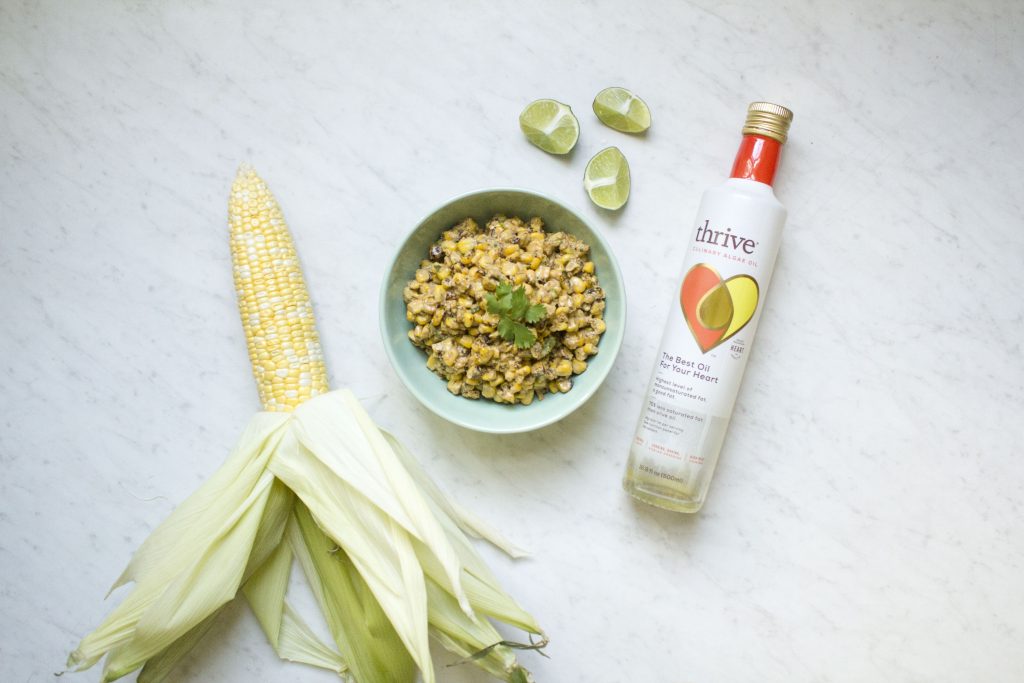 - Remove the husks from the corn, and rub with Thrive Algae Oil. Throw on a grill and cook until cooked through and slightly charred. Alternatively, you can also cook them on a cast iron skillet. Wait until they cool enough to handle, then remove the corn from the ear. (You can also buy fire roasted corn frozen and thaw!)