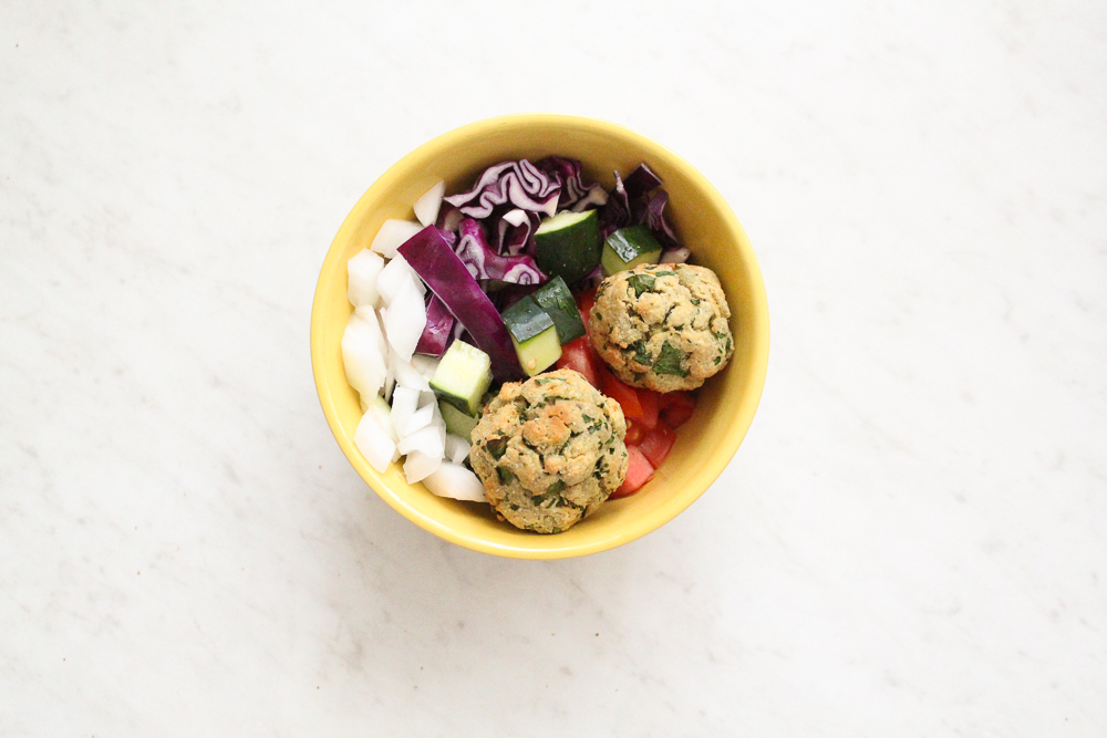 A traditional falafel recipe calls for chickpeas or fava beans, herbs, onions, and spices. It is usually served in a pita with lettuce, tomatoes, cucumbers. I personally love adding fresh onions, too! You can top your falafel pita with tahini (which is Paleo and Whole30 compliant) or my Tzatziki sauce.