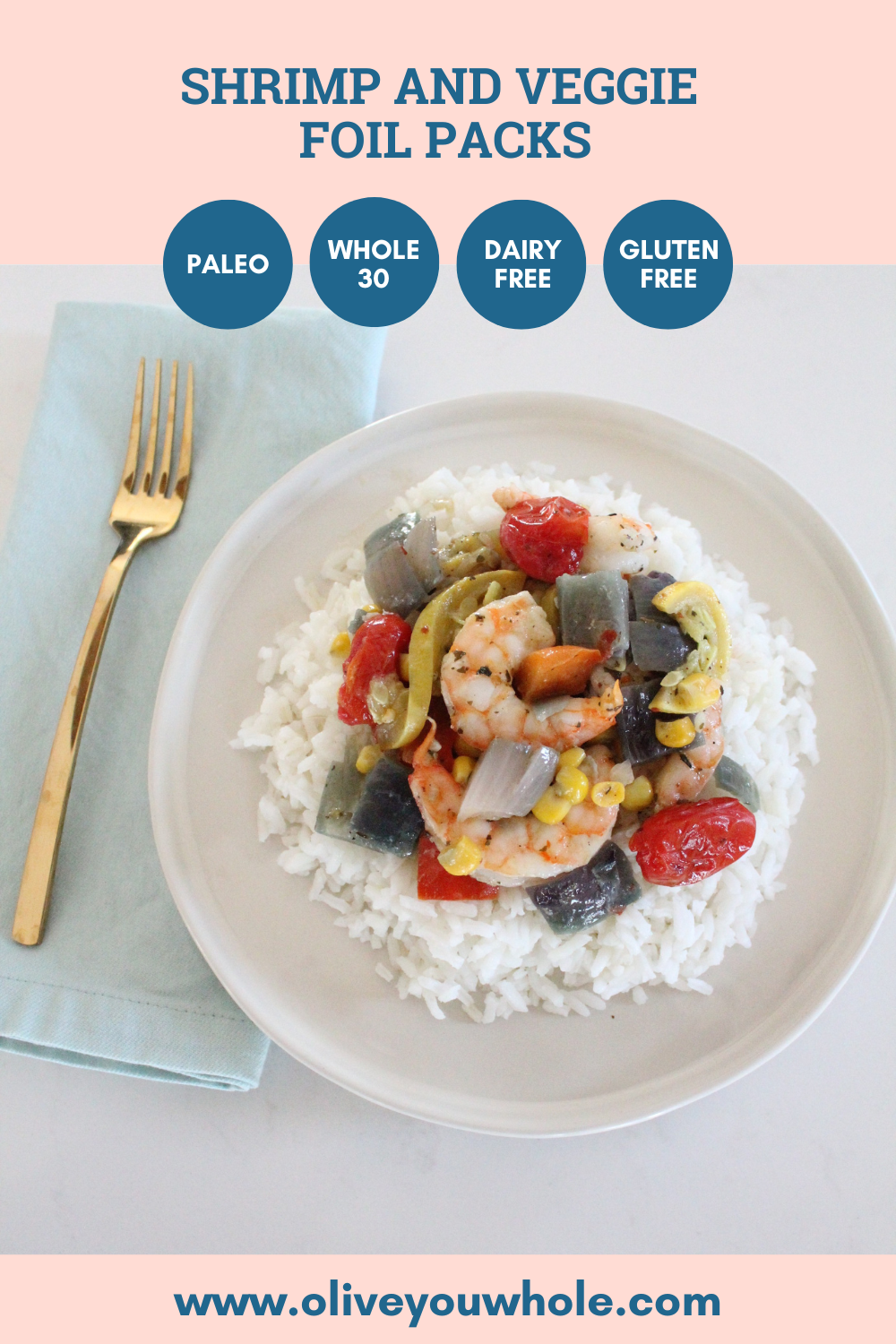 This Shrimp and Veggie Foil Packs recipe can be customized to use whatever vegetables you prefer or whatever you have on hand. Its a great way to empty out that veggie drawer when you need to eat up what you’ve got before it goes bad. The key is to cut your veggies into similar size shapes so that they will cook evenly. Toss your veggies with the shrimp, spices, herbs and olive oil and wrap in foil. These go great on the grill or straight onto the rack in your oven.