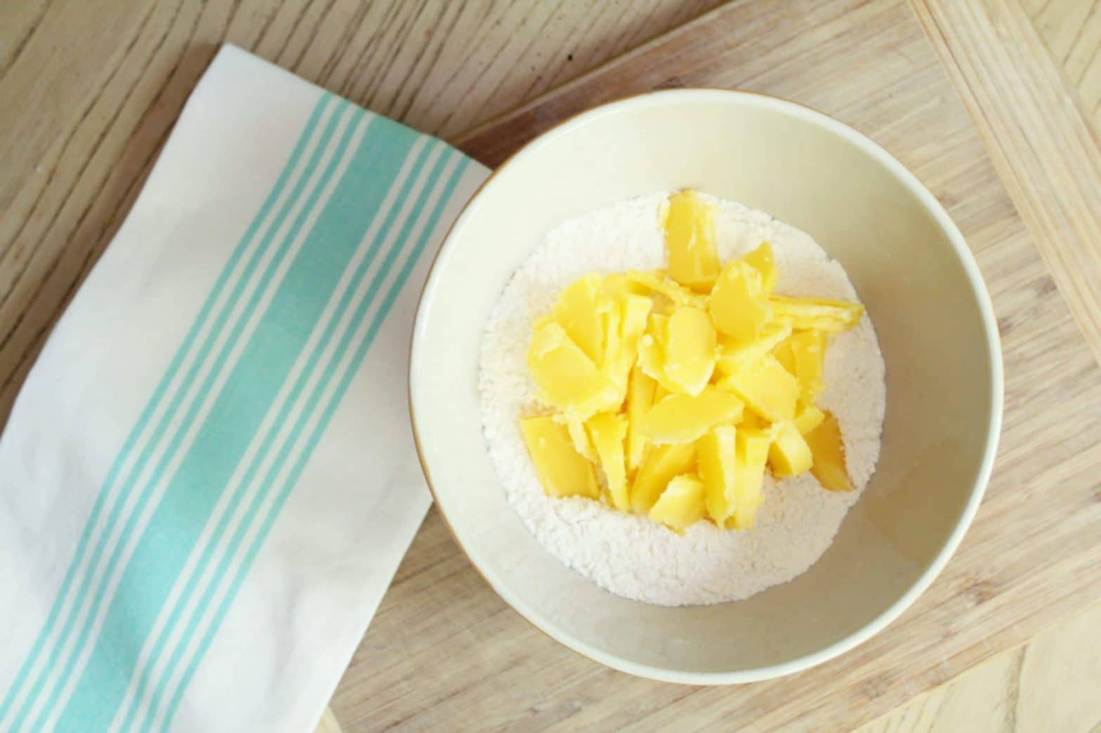 Into the dry mixture, cut the ghee. Make sure that it is really cold- this is essential for biscuits!