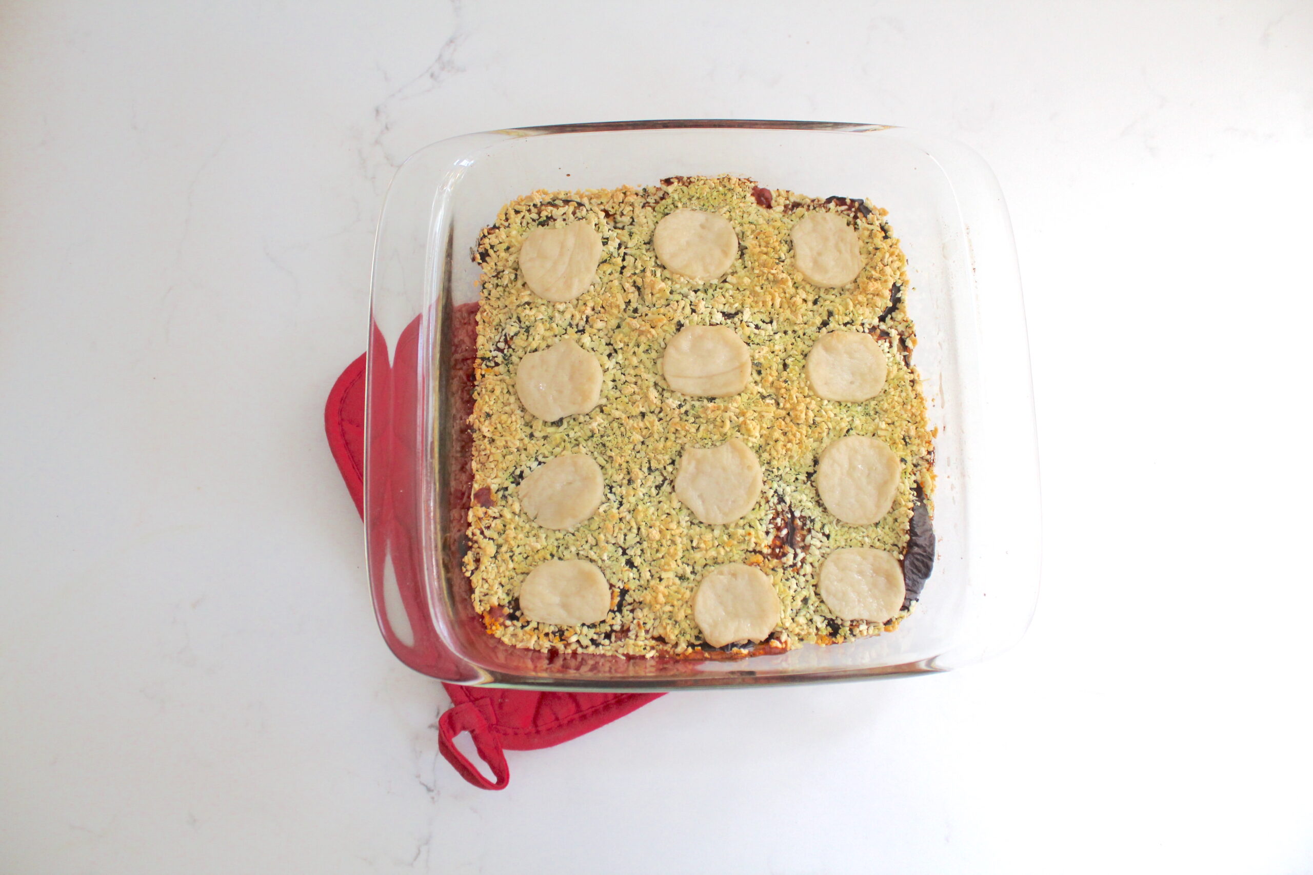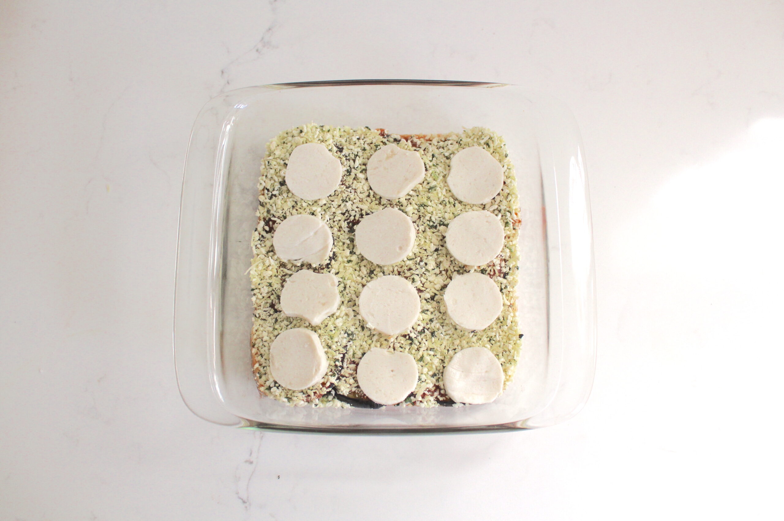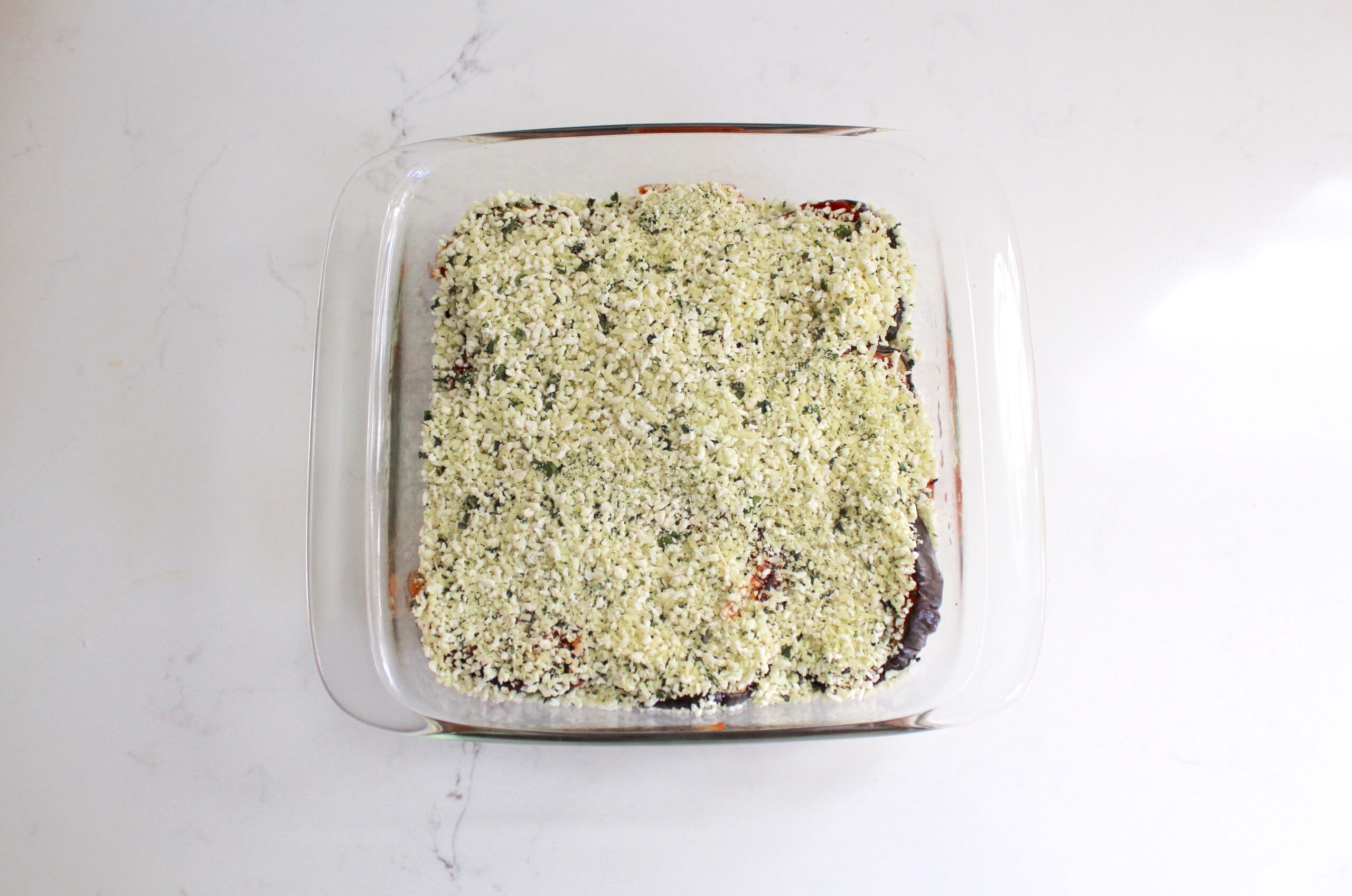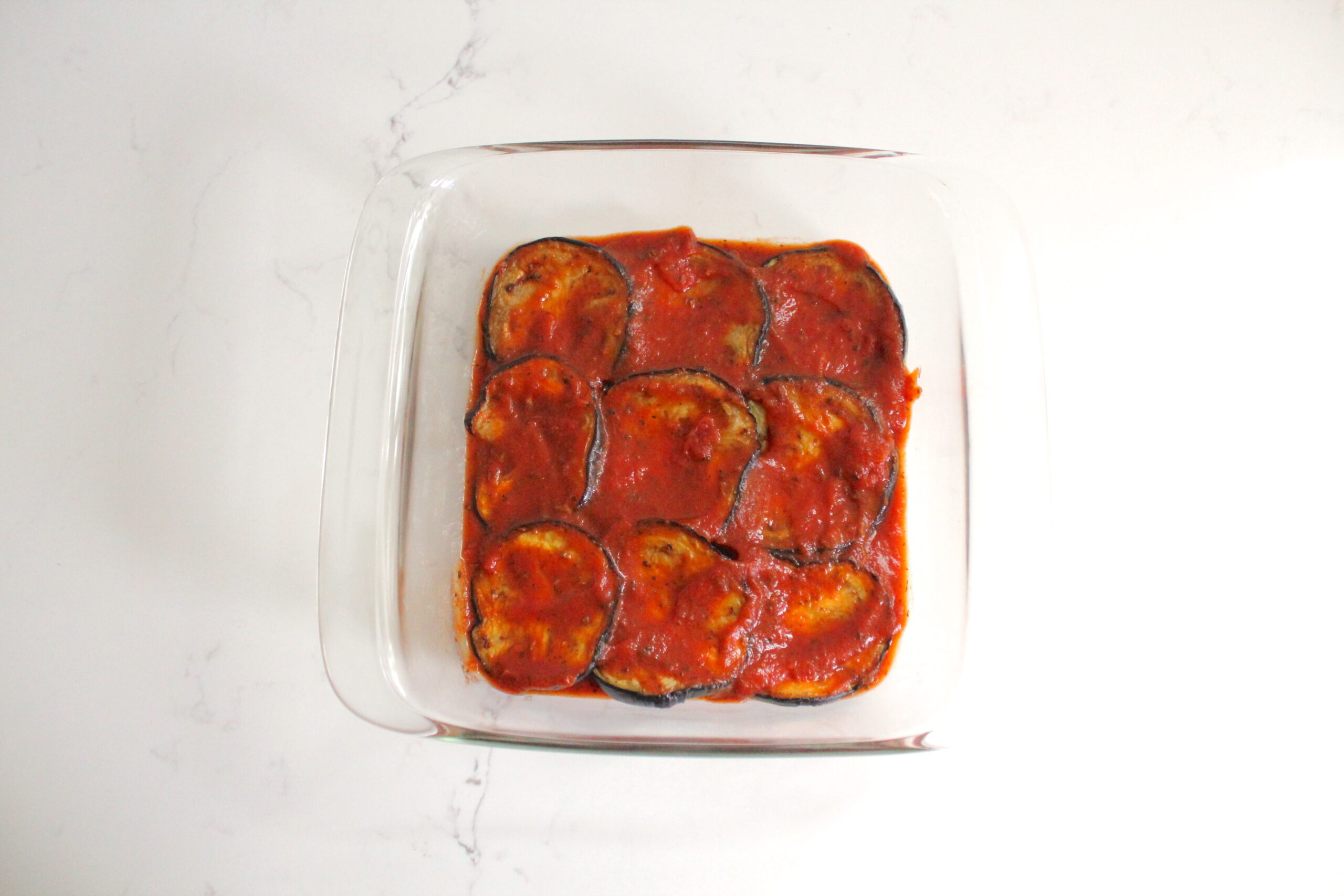 - Spread ½ cup pasta sauce over a 8x8" baking dish; top with a layer of eggplant slices (trim as needed). Drizzle ½ cup sauce over and sprinkle with ½ of the panko mixture plus half of the slices of mozzarella. Repeat these layers of eggplant slices, sauce, panko mixture, and sliced mozzarella.