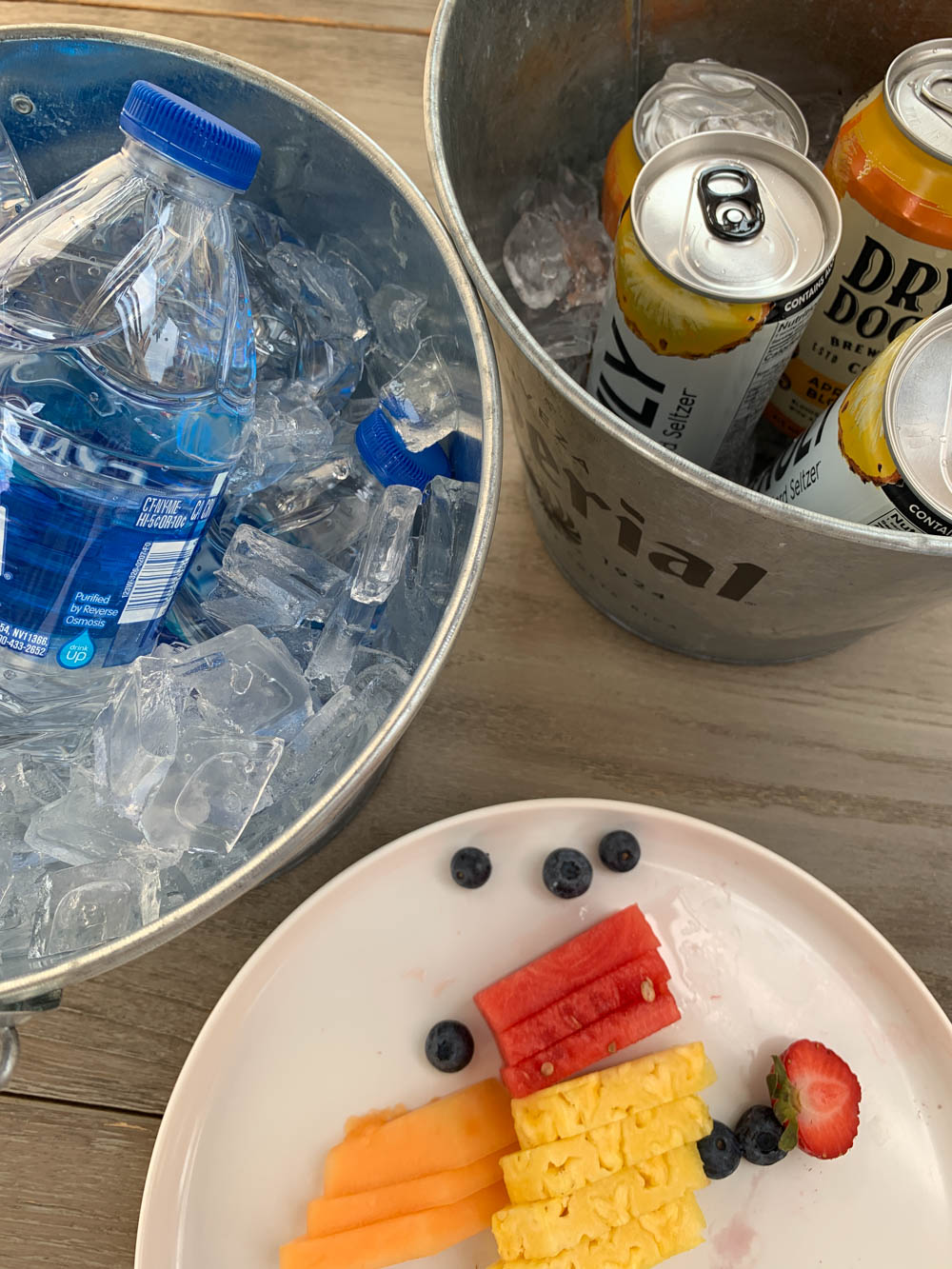 One of the days we were at the pool, we got a cabana! It was so much fun. It’s right next to the pool, so we were able to have a permanent spot that Chaz and I could lounge right in front of Ella and Owen playing in the pool. It has a large sofa, chairs, a television, and a mini fridge.