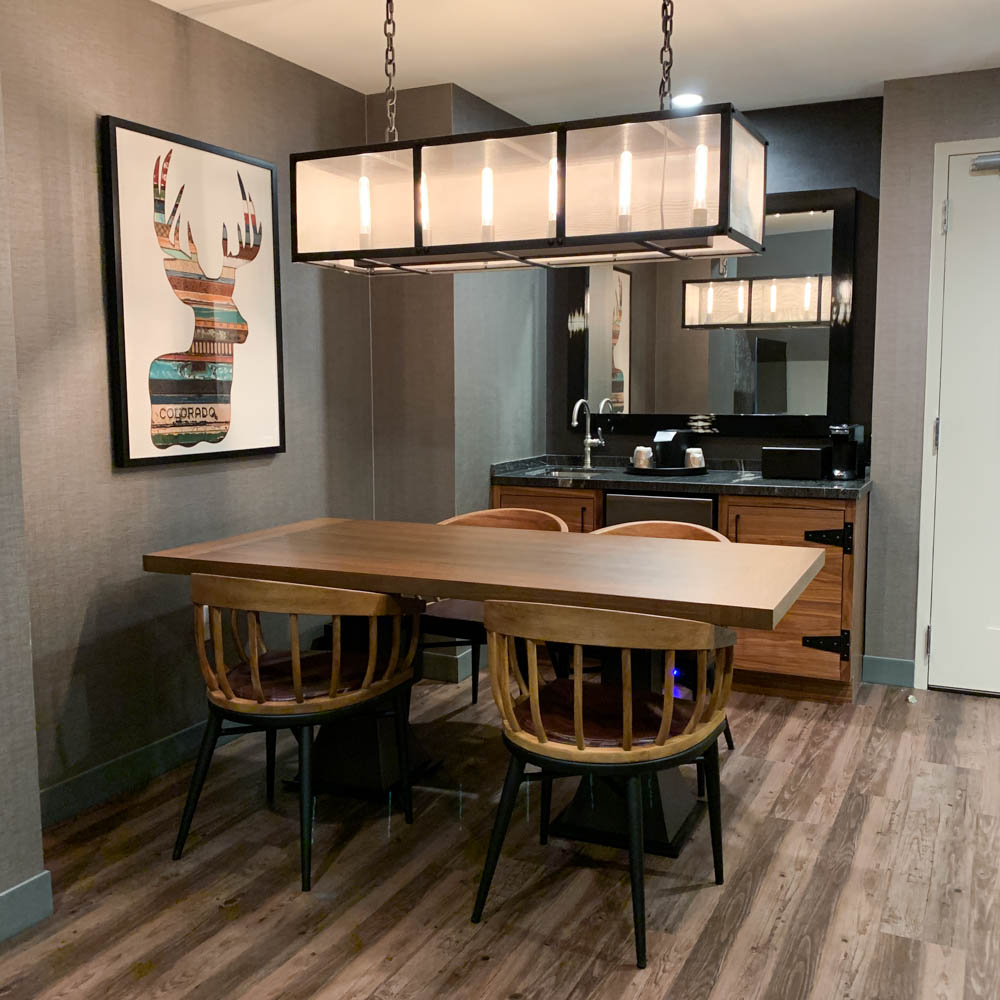 We got to stay in a Deluxe Suite which had its own King Bed for the parents and our kiddos slept in the living room area on the sofa bed. This suite was fantastic. There was a kitchenette, a dining table, a living area, a large bedroom with a king bed, and a bathroom. My new favorite thing is suites with a separate area for the kiddos. I just don’t sleep well when they’re in my room! 🙂